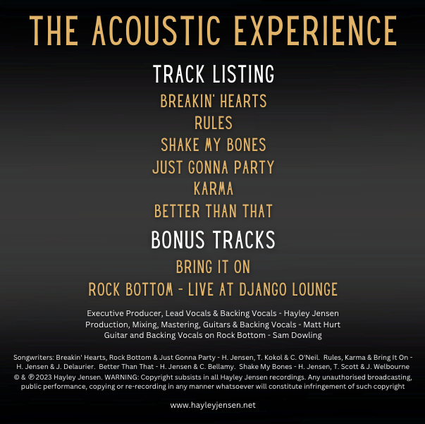 The Acoustic Experience CD includes a number of songs from Hayley’s ARIA #1 Country Album ‘Breakin’ Hearts, PLUS new singles ‘Bring It On’ & ‘Rock Bottom’ in a stripped back, acoustic recording.